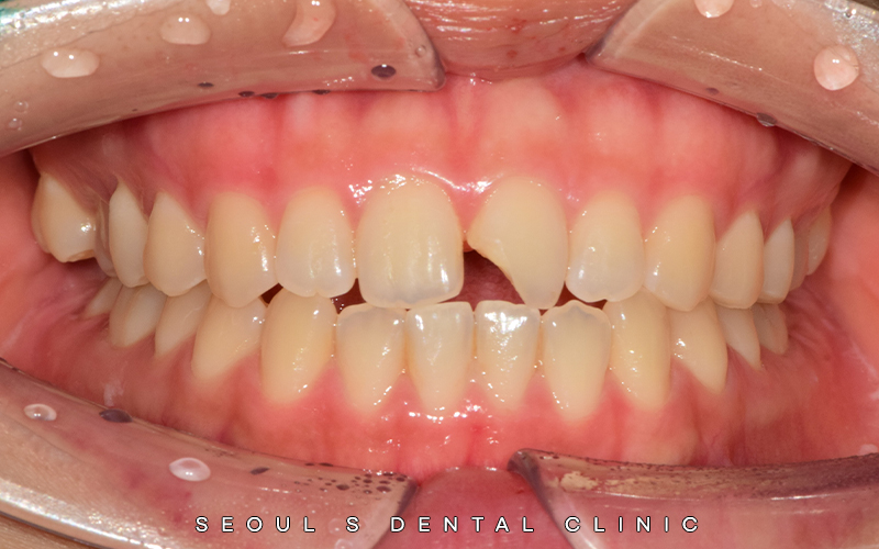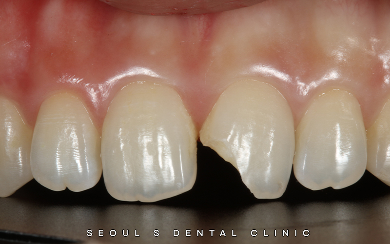 왼쪽 큰 앞니가 파절된 상태로
